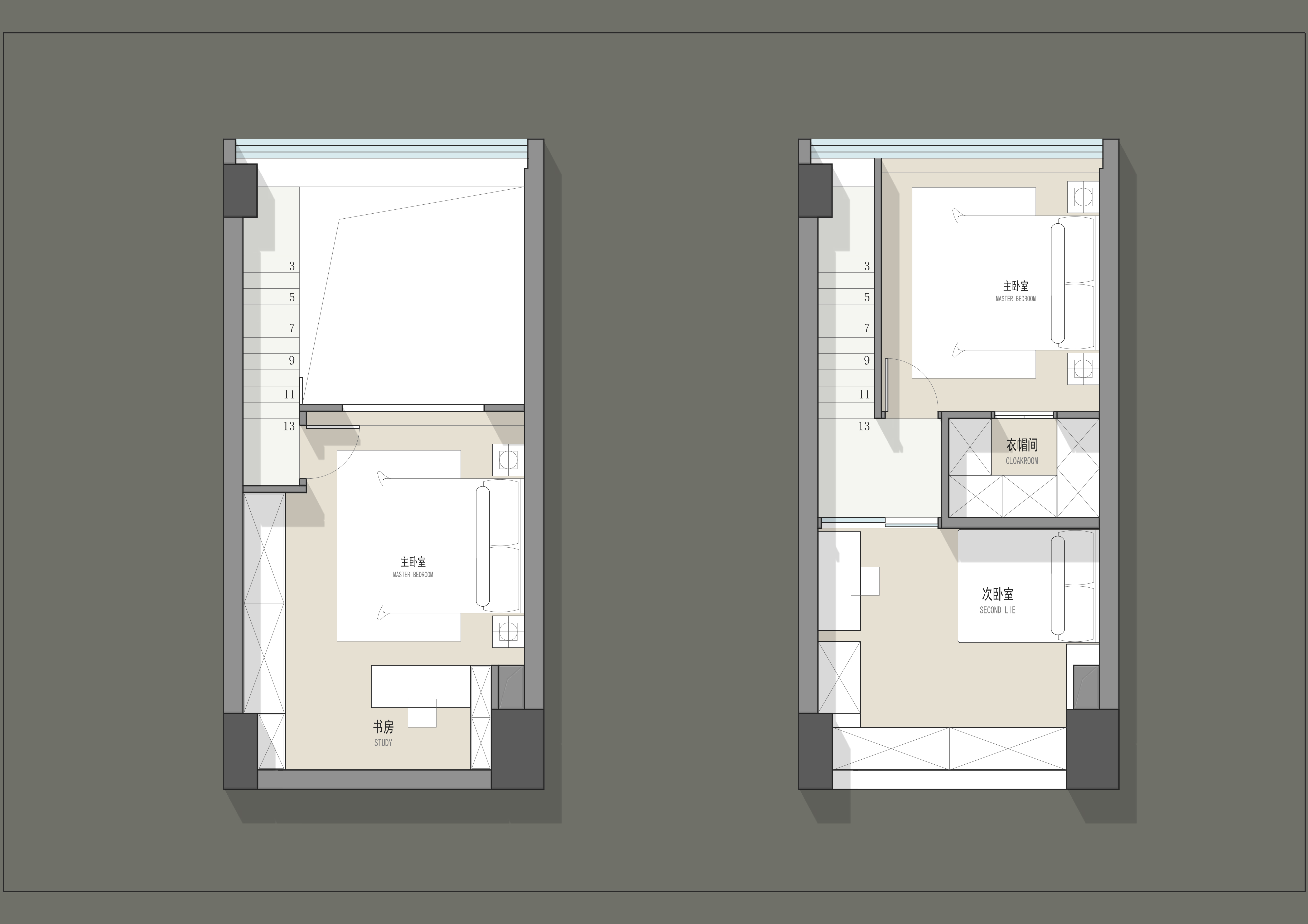 二樓做了兩個(gè)形式的變動(dòng),一個(gè)是單獨(dú)房間,另一個(gè)是兩個(gè)房間,還可以多一個(gè)更衣室