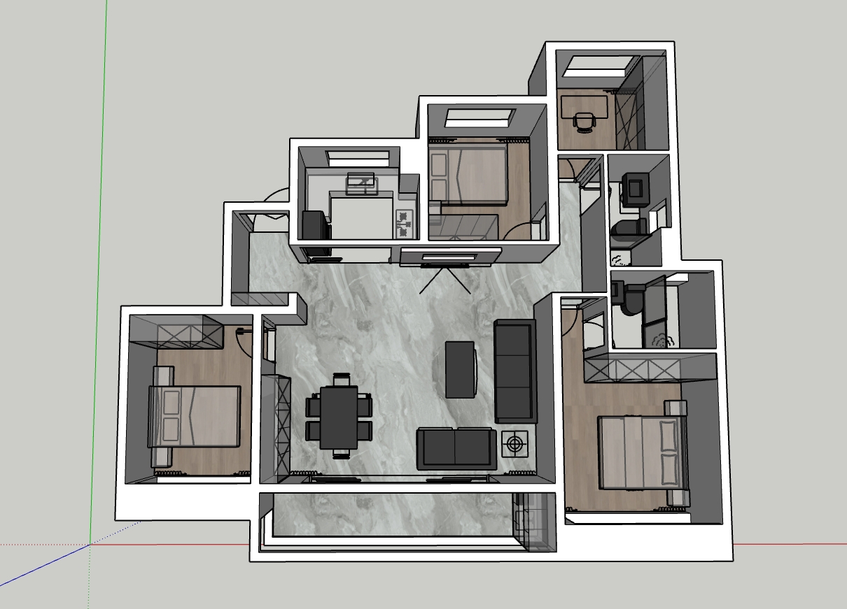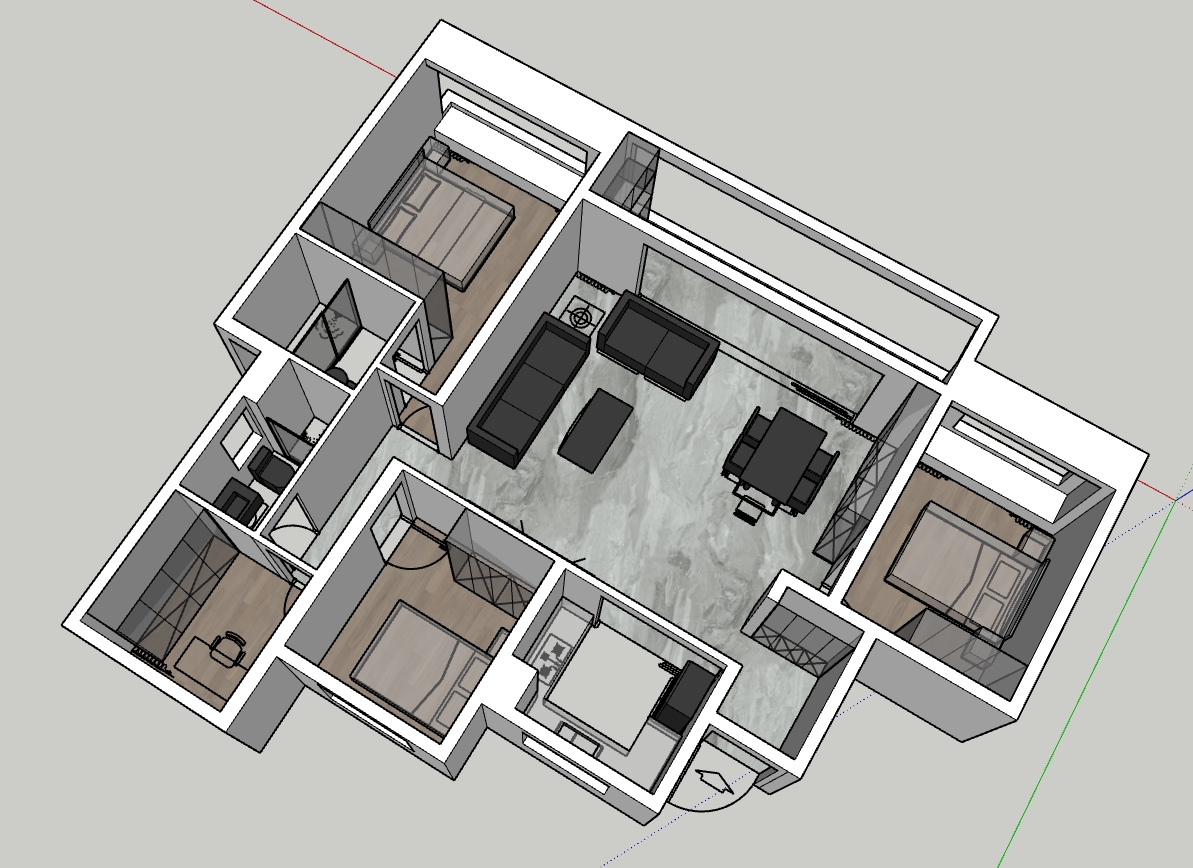 方案一,客餐廳一起,保留原陽臺(tái)的獨(dú)立空間。